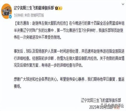 北京时间11月11日,根据辽宁男篮官方的公示,在今晚进行的第十四届全运会男篮成年组半决赛辽宁对阵广东的比赛中,第一节比赛进行至7分多钟时,我俱乐部球员赵继伟在一次突破进攻中不幸受伤倒地。