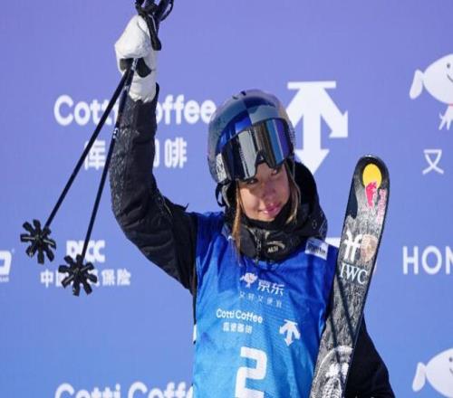 12月11日,中国选手谷爱凌在国际雪联自由式滑雪U型场地技巧世界杯女子组资格赛后。新华社发
