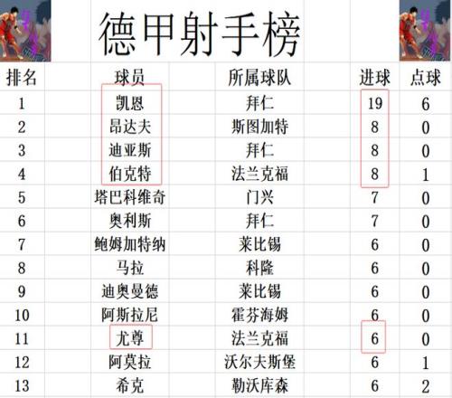 射手榜方面,拜仁同样是优势巨大,凯恩19球遥遥领先,比第2的昂达夫,迪亚斯和伯克特等人多了11球之多。尤尊今天打入一球,追上希克,鲍姆加特纳等人,6球刚好挤入前十。