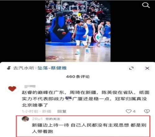 起因是他在社交媒体上与新疆球迷的隔空互怼。当有球迷评论“赵睿巅峰在广东,周琦在新疆”时,赵睿回应:“新疆边上待一待,自己人民都没有主观思想,都是别人带着跑。”随后面对“陈盈骏是不是气你两罚不中”的调侃,他直接回怼:“回去打馕吧。”