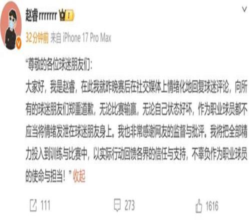 上一篇: 赵睿不当言论后致歉:情绪化回复,不应将情绪发泄在球迷朋友身上