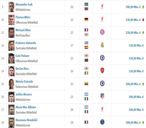 凯塞多加入亿元先生俱乐部!五大联赛目前18人身价超1亿欧